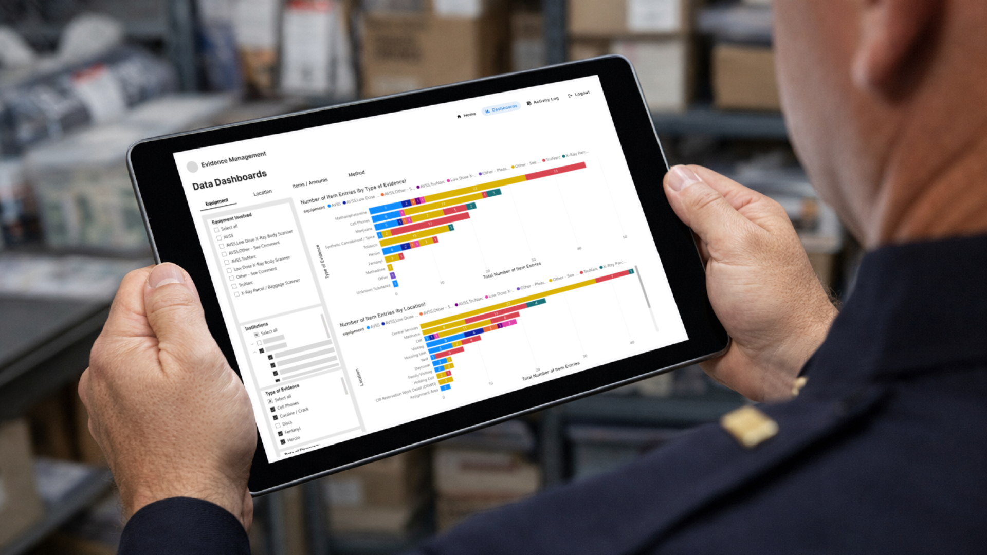 Mock image of a correctional officer using the Evidence Management application on an evidence room tablet.